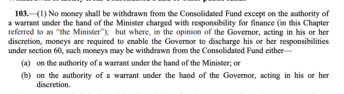 According to the Premier, he was informed that Section 103 of the constitution will likely be used for the two expenses (the Speaker’s and the governor’s fees).