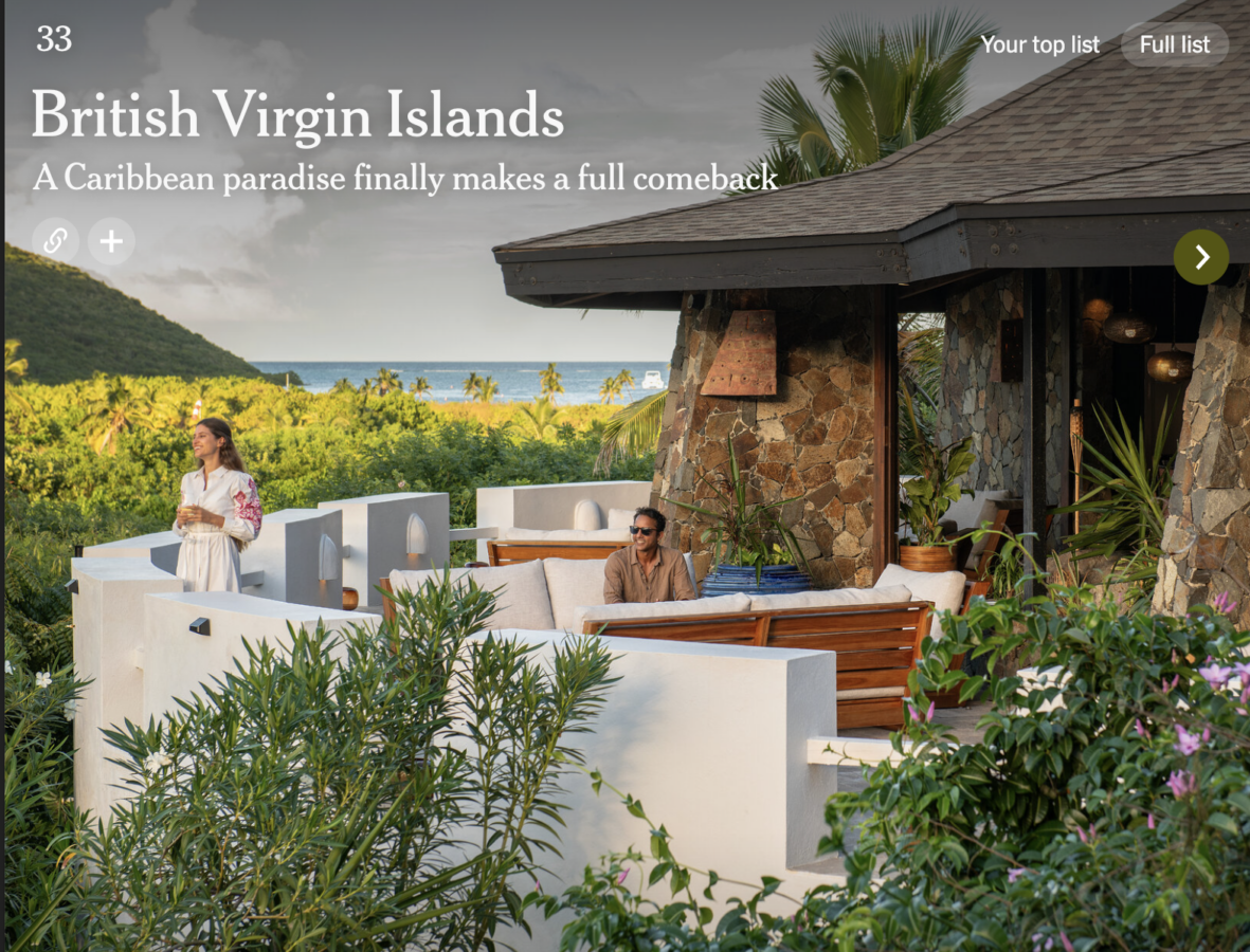 The British Virgin Islands (BVI) has earned the number 33 rankng in New York Times’ annual and coveted 52 places to go in 2025 with the BVI being one of only two Caribbean destinations featured in the article.