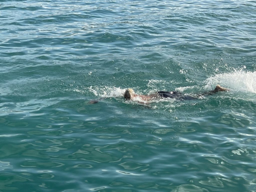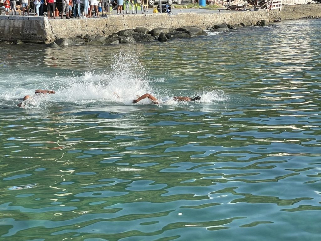 Despite rumours that the swimming race would not take place, the rumours were quickly cleared up as the announcer urged interested participants to sign up. It was announced that Penn would sponsor the race and award a cash prize of $200 to the winner. A man from Carrot Bay named Zach stormed away from the four other competitors in the event.